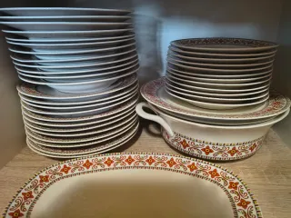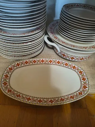 Elegante servizio completo in porcellana, perfetto per ogni occasione. Il design presenta un raffinato bordo decorativo. - Bordo decorativo con motivi rossi e dorati. - Piatto da portata ovale incluso. -Piatto da portata tondo incluso -Zuppiera - 12 piatti piani 12 piatti fondi 12 piattini dolce