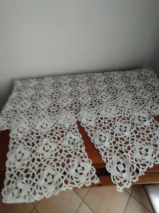 Delicati centrini realizzati all'uncinetto, perfetti per aggiungere un tocco artigianale alla tua casa. - Motivo floreale centrale. - Bordi rifiniti con dettagli. - Ideali per como e comodini o anche altro - misure due cm 24 x 24 e uno cm 28 x 75