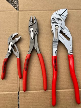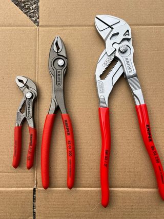 Set di tre pinze chiave Hape Hnipex, ideali per diverse esigenze. - Pinze con impugnatura rossa. - Materiale metallico resistente.