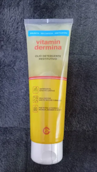 Olio detergente restitutivo Vitamina Dermina, ideale per pelli secche e sensibili, 250 ml. - Antiprurito, effetto lenitivo. - Per neonati, bambini e adulti. - Flacone giallo.