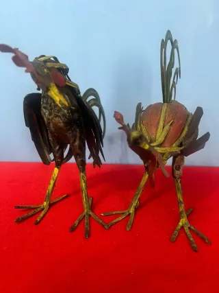 Coppia decorativa di galli, realizzata in metallo , ferro battuto con dettagli colorati. - Materiale: Metallo - Colore: Bronzo, verde e rosso - Design: Dettagliato e artistico