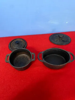 Set di due pentole in ghisa con coperchio, perfette per la cucina. In miniatura vedi le misure nelle foto - Materiale: ghisa - Colore: nero - Include coperchi