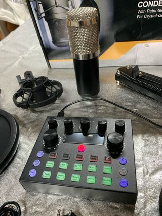 Kit completo per live streaming e registrazioni audio. - Microfono a condensatore professionale. - Supporto da tavolo regolabile. - Filtro anti-pop. - Scheda audio/mixer. - Cavi inclusi.