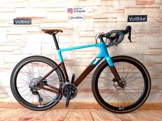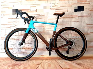 Bicicletta Gravel 3T Racemax. - Taglia 56. - Telaio in carbonio. - Colore blu e marrone. - Manubrio con nastro decorato. - Sella in cuoio marrone. - Ruote gravel un carbonio