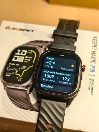 Smartwatch Kospet P10 con cassa in acciaio. Design robusto e moderno. - Cassa in acciaio inossidabile. - Cinturino resistente e confortevole. - Quadrante personalizzabile. Schermo OLED, GPS, altimetro e barometro Un po' segnato causa recenti escursioni. Disponibile per altre foto macro