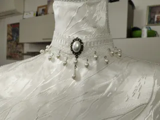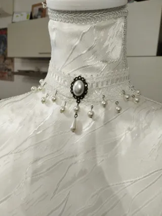 Elegante collana in pizzo bianco, perfetta per un look gotico o vittoriano. Presenta dettagli in pizzo e una pietra centrale ovale. - Collana con pendente centrale. - Decorata con perle. - Chiusura sicura. I prezzi sono trattabili