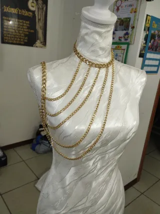 Elegante gioiello per il corpo a catena dorata, perfetto per completare un look audace. - Design multistrato con diverse catene. - Finitura color oro lucido. - Si indossa come una collana e scende sul petto. I prezzi sono trattabili