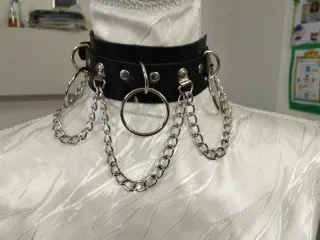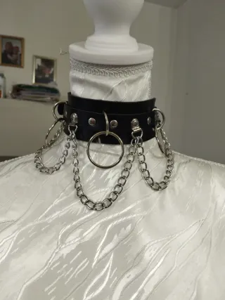 Collare da donna con un design audace e moderno, perfetto per aggiungere un tocco di stile unico. - Realizzato in ecopelle nera. - Dettagli in metallo argentato. - Decorato con catene e anelli. - Chiusura regolabile. I prezzi sono trattabili