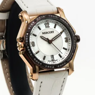 Vendo orologio da polso Mercury da donna nuovo mai indossato con scatola originale e adesivi di fabbrica ancora attaccati. Acquistato direttamente dal produttore ho una Garanzia valida fino al 28 gennaio 2028 Model: ME1080-RCL-S-1 Quadrante: bianco. Lancette e indici color cioccolato. Quadrante rotondo. Dimensione della cassa: 37 mm. Spessore della cassa: 10,20 mm. Materiale della cassa: acciaio inossidabile color oro rosa PVD e cioccolato, lunetta con zirconi. Cristallo di minerale Movimento: quarzo svizzero Cinturino in vera pelle bianca con chiusura a farfalla. Larghezza delle anse: 20mm Impermeabilità: 30 m (3 ATM, 10