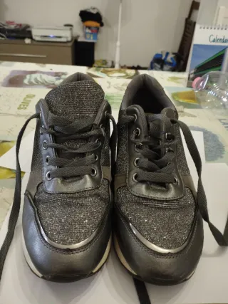 Scarpe da ginnastica con chiusura a lacci. - Dettagli glitterati. - Inserti in materiale scamosciato. - Suola in gomma. I prezzi sono trattabili