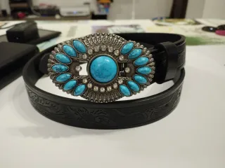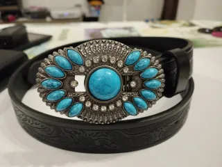 Cintura unisex con un design ispirato allo stile Western. La fibbia è decorata con pietre turchesi e dettagli argentati. - Fibbia ovale con pietre turchesi. - Cornice decorata con strass. - Cintura in similpelle nera con incisioni. - Stile Western. I prezzi sono trattabili Lunghezza 80 cm