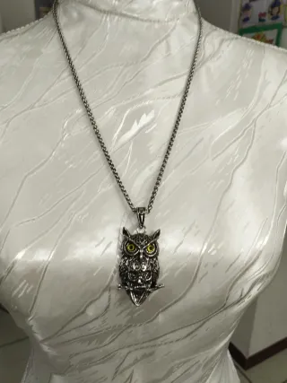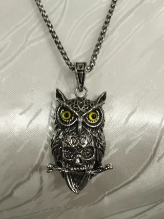 Collana con ciondolo a forma di gufo con teschio. - Ciondolo in metallo argentato. - Dettagli color giallo sugli occhi del gufo. I prezzi sono trattabili