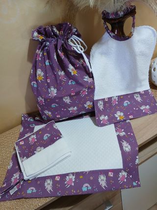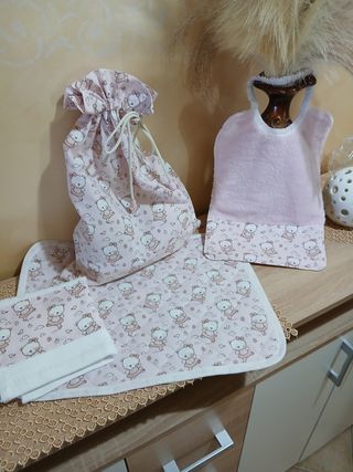 Set asilo per bambini con simpatico orsetto. Il set è realizzato in tessuto rosa con una stampa di orsetti ballerini.Set asilo con fatine. Set asilo con Topolino, set asilo con spidermen, ogni singolo set ha disponibilità immediata con possibilità di personalizzare con nome , il prezzo e riferito a singolo set . - Sacca con chiusura a coulisse. - Bavaglino in spugna. - Tappetino imbottito. - Piccolo asciugamano.