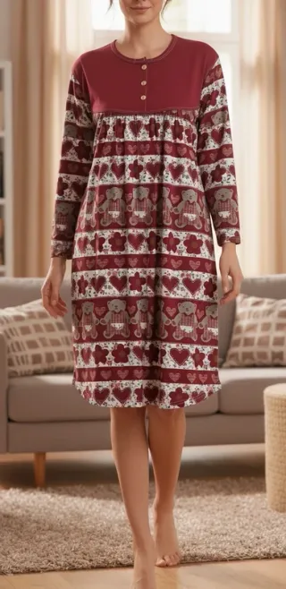 Camicia da notte in puro cotone, perfetta per le fredde serate invernali. - Fantasia a tema natalizio con orsetti e cuori. - Maniche lunghe. - Scollo rotondo con bottoncini. - 100% cotone - Taglia 46 M