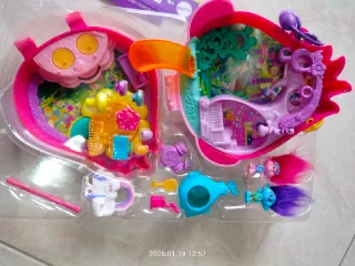 Playset Polly Pocket a tema Trolls, con personaggi e accessori. - Personaggi inclusi: Poppy e Branch. - Accessori a tema musicale e arcobaleno. - Design colorato e divertente.