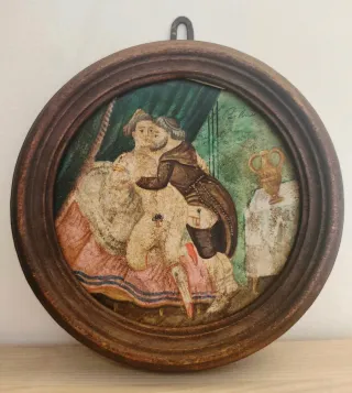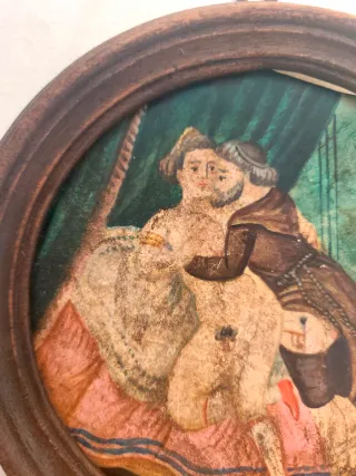 Dipinto su sezione lignea rotonda (diametro 26 cm), raffigurante una scena galante in stile settecentesco, con una nobildonna e un membro del clero in intimità in un interno d’epoca. Realizzato con tecnica a tempera o olio, presenta colori caldi e dettagli rococò. La cornice integrata in legno massello conserva la patina originale. Probabile opera di iinizi XIX secolo, ispirata alla pittura libertina. Oggetto raro, ideale per collezionisti o ambienti eclettici. Buone condizioni generali, pezzo di forte impatto decorativo e storico, espressione dell’arte licenziosa d’epoca.