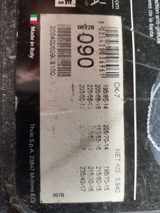 Catene da neve Thule CK-7, misura 90. Sono le catene più sottili al mondo, con protezione anti-graffio per i cerchi. Spessore catena 7mm nuove con sigillo mai aperto. Controllare applicazioni sull'etichetta. - Modello: CK-7 - Misura: 90 - Omologazione: TUV - Certificazione SAE: 7 - Protezione cerchi in lega: Sì - Made in Italy