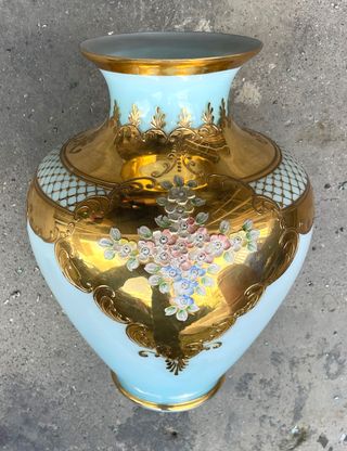Vaso in vetro opale traslucido di media grandezza, colorato di azzurro con eleganti decorazioni in oro zecchino in ottime condizioni. Dimensioni: diametro 25 cm, altezza 35 cm.
