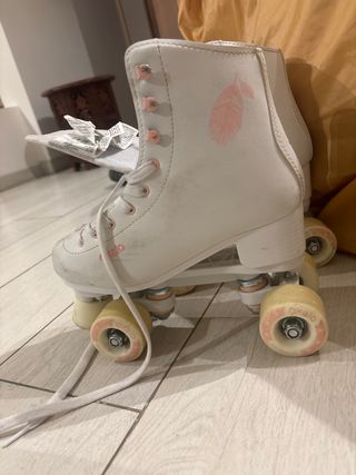 Pattini a quattro ruote bianchi marca Oxelo, taglia 38 - Design con piume rosa. - Lacci bianchi. - Ruote color crema con dettagli rosa.