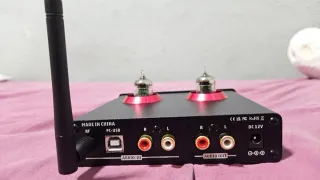 Preamplificatore con DAC e valvole. - Ingresso PC-USB - Ingresso Audio IN (RCA) - Uscita Audio OUT (RCA) - Ingresso RF - Uscita DC 12V - Design compatto con finiture rosse sulle valvole Vedi anche altra mia inserzione ottimale