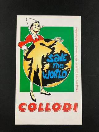 Cartolina con Pinocchio che abbraccia il mondo. - Illustrazione di Pinocchio di Carlo Collodi. - Anno di produzione: 1997. - Logo della Fondazione Nazionale Carlo Collodi.