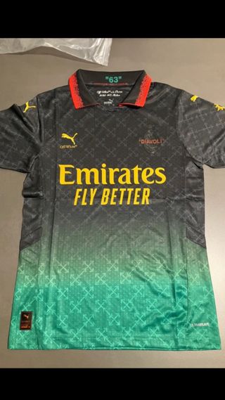 Maglia da calcio del Milan, edizione speciale Puma x Off-White. - Colore nero con sfumatura verde. - Logo Puma e Off-White sul petto. - Sponsor Emirates Fly Better. - Dettaglio DIAVOLI sul colletto. - Etichetta 63 sul colletto.