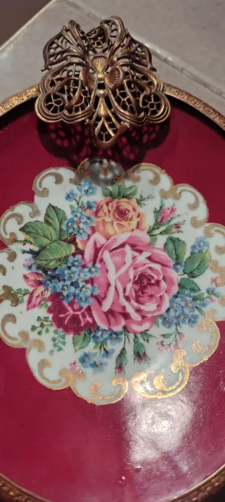 Raro e introvabile bellissimo svuotatasche o posacenere ovale in porcellana vintage J.K.W. Joseph Kuba con decoro floreale. Decoro bordo e farfalla filigrana dorata Tenuto in vetrinetta come decoro - Cornice dorata. - Motivo floreale con rose e fiori blu. - Finitura lucida.