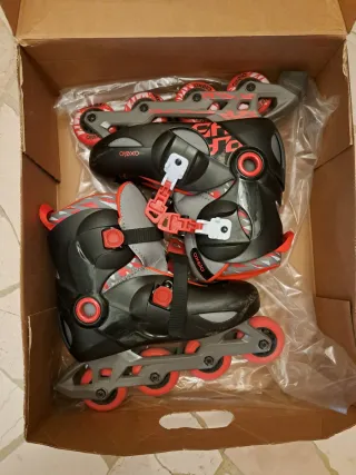 Pattini in linea Oxelo, misura regolabile da 34 a 36. - Colore nero e rosso. - Chiusura con lacci, velcro e fibbia. - Ruote rosse. Usati 2 volte. Se interessa ho anche la borsa portapattini in altro annuncio.