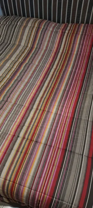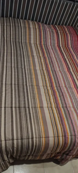 Trapunta Caleffi per letto matrimoniale con un vivace disegno a righe,base marrone, bordeaux ,con fucsia arancio, dietro panna 259 x 250 si può utilizzare sia con disegno verticale che orizzontale oppure con retro tinta unita Vendo perché troppo caldo per mio marito 🤗 - buonissime condizioni - Fantasia a righe multicolore. - Tessuto in cotone