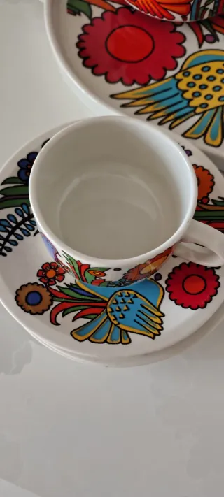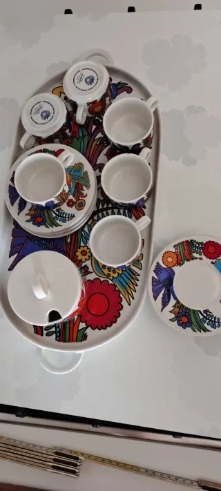 Elegante servizio da caffè Villeroy & Boch con vassoio, perfetto per ogni occasione,linea Acapulco con logo blu di prima produzione 1967 design Christine Reuter di ispirazione messicana - Design vivace e colorato. - Include 6 tazze 6 piattini zuccheriera e vassoio - 14 PZ - Vassoio ovale con manici.