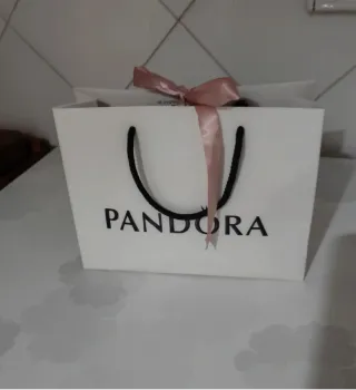 Busta regalo Pandora, ideale per confezionare un pensiero speciale. Misura piccola 21 x 16 x 8 - Colore bianco con logo Pandora. - Nastro rosa in raso per chiusura. - Manici neri. - Ideale come confezione regalo.