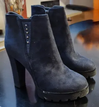 Eleganti stivaletti invernali con un design moderno. - Materiale scamosciato. - Dettagli con borchie decorative. - Zip laterale per una facile calzata. - Tacco largo e plateau anteriore.