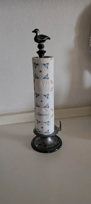 Elegante portarotolo da cucina vintage, con una simpatica anatra decorativa sulla sommità,molto vissuto, presenta ancora parti dipinte in verde che ne danno un fascino retro Alla base nascosta presenta perno se si volesse smontare,misure in foto Peso 1 kg circa - Struttura in metallo. - Base decorata.