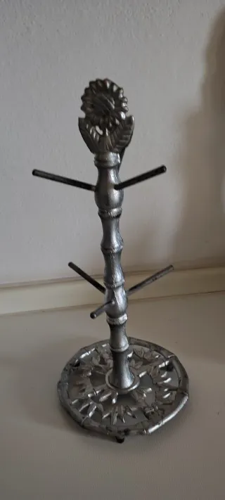 Offerta Natale da 20€ Elegante porta tazze dal design vintage, perfetto per organizzare le tue tazze o i tuoi gioielli - Struttura in metallo ghisa finitura argento. - Base decorata con motivi floreali, peso 1 kg - Design a forma di albero con rami per appendere le tazze, staccabili - Finitura anticata che aggiunge un tocco di classe.