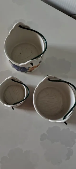 Articoli rari,Set di tre cestini in ceramica di Friuli, decorati a mano con fiori colorati. Un paio all interno presentano crepe dovute al tempo,molto vecchi Mai utilizzati se non in esposizione Del marchio Zoppola Pordenone, dipinti a mano - Decorazione floreale vivace. - Manico in metallo verde. - Ideali come portaoggetti o decorazione.