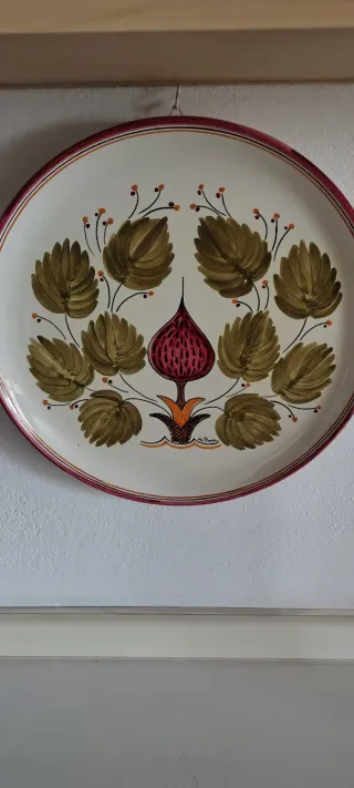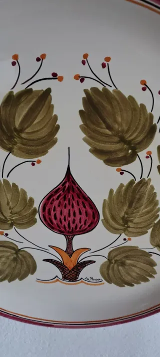 Piatto decorativo da parete della marca La Pisana, realizzato in ceramica, dipinto a mano - Motivo floreale centrale con foglie verdi e bacche. - Bordo decorato con strisce rosse e marroni.