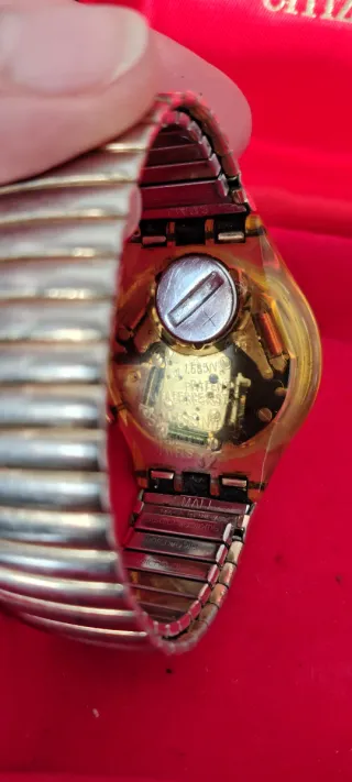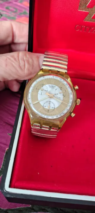 Orologio Swatch Crono Golden Globe con cassa trasparente e cinturino in metallo elastico dorato. Offerta perché va revisionato,ha smesso di funzionare, probabilmente basta sostituire la batteria - Made in Svizzera 1991/92 - Quadrante color oro con dettagli bianchi. - Funzione cronografo. - Datario. - Movimento al quarzo.