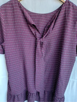 Elegante blusa bordo prugna con un grazioso fiocco sul davanti e un motivo a disegni geometrici effetto cravatta. Il tessuto ha una finitura liscia che ricorda la seta. Balza sul fondo, adatta ad ogni outfit Spalle 39 seno 48 lunghezza 62 Vestibilità fino 44 - Maniche corte. - Orlo con volant.