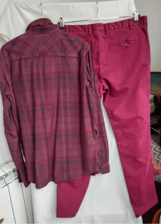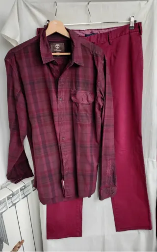 Set composto da camicia a quadri bordeaux e pantaloni ( colore meno acceso delle foto) Camicia Usata una volta ,cotone invernale Pantaloni nuovi Spalle 47 torace 56 Manica 70 - Camicia Timberland a quadri bordeaux prugna - Pantaloni tinta unita bordeaux Vita 49 fianchi 57 lunghezza 102