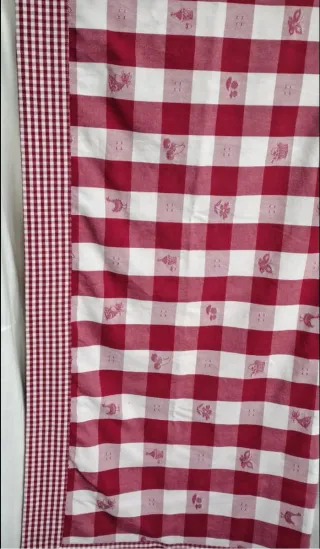 Offerta Natale da 20€ Set composto da una tovaglia e otto tovaglioli con motivo a quadri bordeaux e bianchi. La tovaglia presenta un disegno a quadretti con piccole decorazioni floreali e animali. Bordo riportato a contrasto e la possibilità di usarla dai due lati Omaggio asciugamani da cucina in spugna,con bordo riportato e ricamo Buone condizioni - Dimensioni tovaglia: 1.30 x 2.00 metri. - Numero tovaglioli: 8.