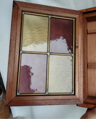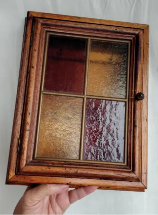 Portachiavi vintage con cornice in legno e inserti in vetro colorato piombato, 28 x 22 x 6 Presenta leggera apertura nel legno all altezza del pomello - Cornice in legno con finitura anticata. - Vetro colorato con sfumature di bordeaux e ambra. - Design a griglia con quattro pannelli. - Piccolo pomello in legno per l'apertura.