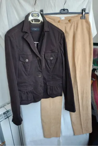 Set composto da giacca Max Mara cotone e pantaloni Motivi Alcantara beige caldo, nuovi, adatto alla primavera - Giacca color marrone scuro con tasche arricciatura, spacco dietro,4 bottoni Seno 50 vita 47 lunghezza 61 - Pantaloni nuovi color beige Vita 38 fianchi 50 lungh cavallo 30 Lunghezza 102 - Taglia 46.