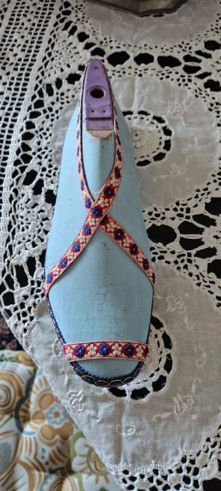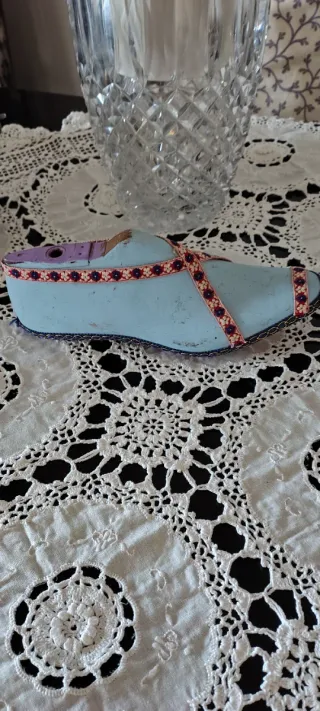 Forma per scarpe vintage anni 30 ,ideale per collezionisti o come pezzo d'arredo. Erano utilizzati da calzolaio come misure per scarpe o poi usati come esposizione vetrina . Legno pieno - Materiale: legno dipinto - Colore: azzurro. - Dettagli decorativi con nastro. - Parte superiore in plastica viola.
