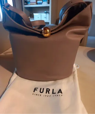 Borsa Secchiello Furla della collezione Primavera 2025. Un accessorio elegante e raffinato. Mod Sfera secchiello vitello Colore malva bronzo lucido ,prima foto rispecchia il colore esatto Larghezza 29 altezza 24 -Nuova con certificato e scontrino di cortesia - Dettaglio metallico dorato. - Design moderno e capiente.