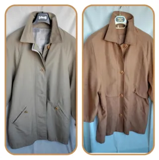 Set composto da due soprabiti da donna in stile vintage. - Impermeabile cachi chiaro,perfette condizioni,di fattura tedesca ,varie tasche Vestibilità fino a 48 Torace 58 lunghezza 85 - Un soprabito color cammello Alcantara In perfette condizioni va solo fatto lavare Con martingala e tasche Torace 60 lunghezza 85
