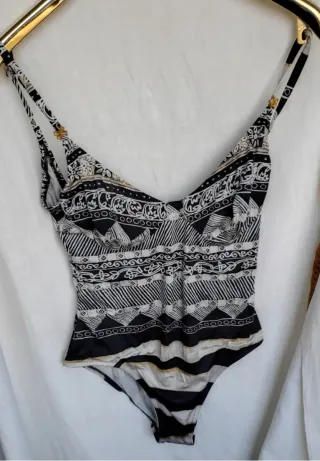 Costume intero con un design etnico e accattivante,coppe mezza fodera,parte davanti foderata Parte dietro tessuto leggermente rilasciato da lavaggi - Fantasia geometrica e floreale. - Spalline sottili con dettaglio dorato. - Scollo a V.