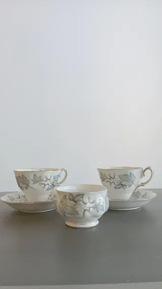 Elegante set di tazze Royal Albert vintage, perfette per aggiungere un tocco di classe alla tua tavola. Porcellana fine. Decorazioni floreale con bordatura in oro. Due tazze. Due piattini e una zuccheriera - Design floreale delicato. - Bordo dorato rifinito. - Materiale in porcellana di alta qualità.