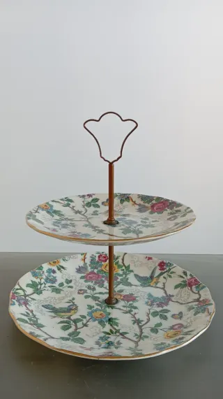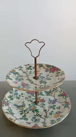 Elegante alzatina in porcellana a due piani vintage inglese, con decorazioni floreali e uccellini. - Design Stafford. - Bordi dorati. - Struttura a due vassoi.