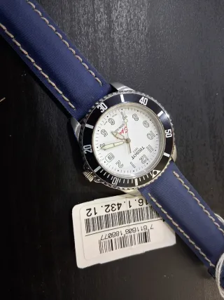 Orologio Tissot Sport con cinturino blu e quadrante bianco. Resistente all'acqua fino a 100 metri. Cassa mm.38 Vintage Quartz funzionante perfetto mai indossato Tutto originale Con cartellino Da stock gioielleria - Movimento Swiss Made. - Cinturino in tessuto blu. Deteriorato all interno. - Quadrante bianco con indici applicati. - Lunetta girevole unidirezionale.