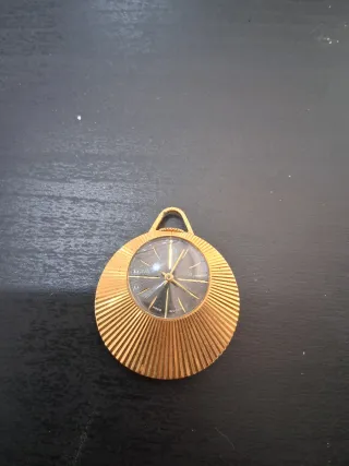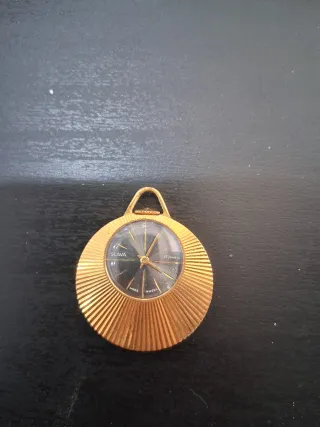Elegante orologio ciondolo Slava, un pezzo unico con finitura dorata. Meccanico vetro rotto NON FUNZIONANTE RARO - Design circolare con dettagli a raggiera. - Quadrante nero con lancette dorate. - Anello per appenderlo come ciondolo.